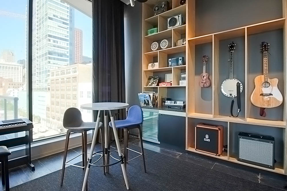 Our last pick for the musically inclined is The Cooper in South Loop. This 452-unit tower includes a feature that even amateur musicians will appreciate. Their “Listening Lounge” is about as cool as it sounds! Stocked with everything from ukuleles and guitars to LPs and a turntable, this little piece of music paradise is going to wow you.