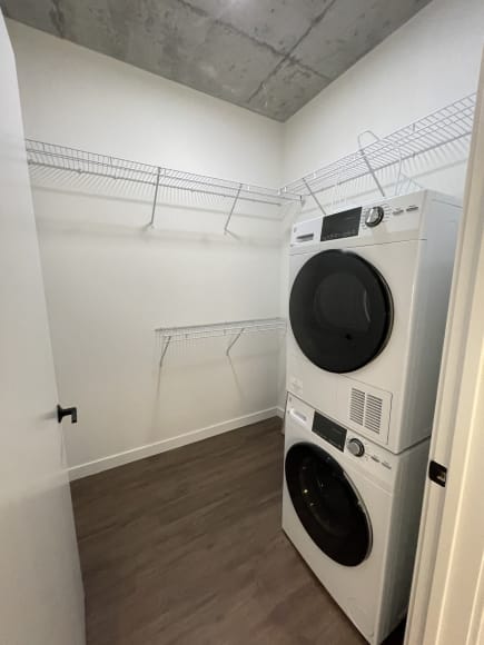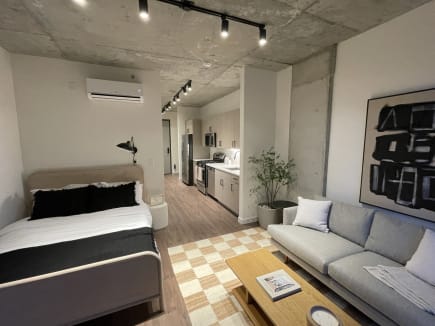 Inside the apartments, you'll find a sleek and modern design with matte black fixtures, stainless steel appliances, tiled backsplashes, and the convenience of an in-unit washer and dryer. Select units (including studios!) even have a private balcony!