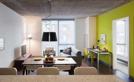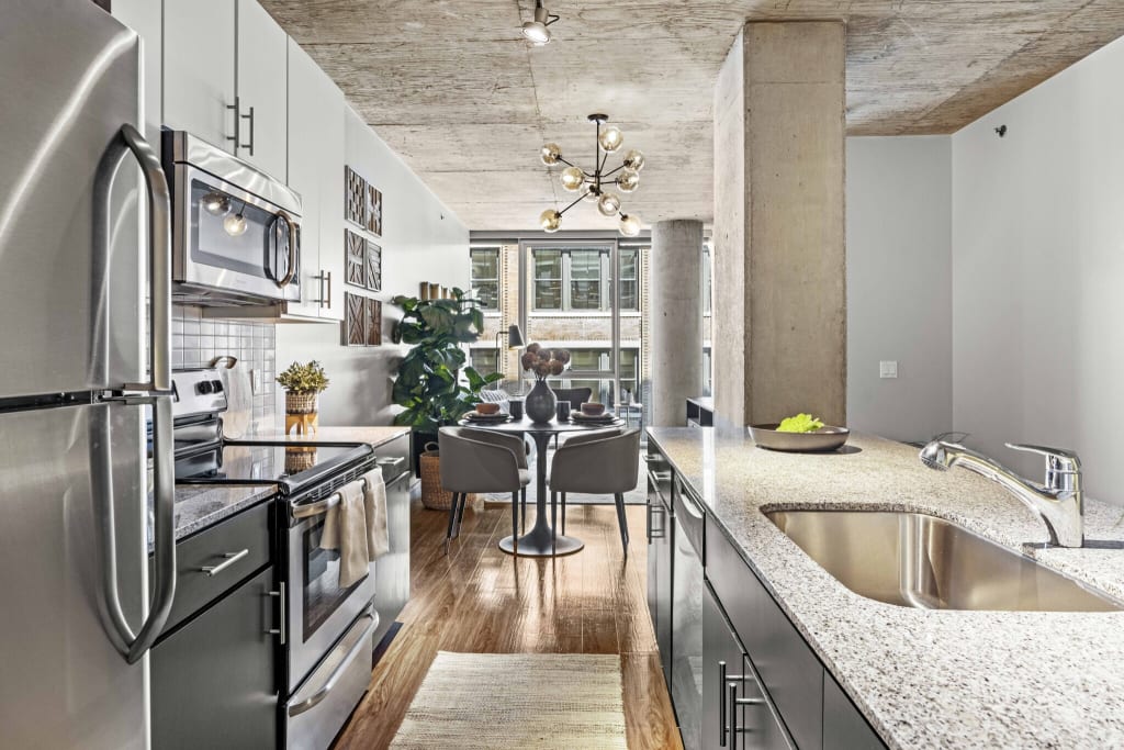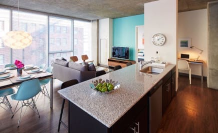 With 15 floors and less than 200 units, this LEED-designed, eco-friendly community is a refreshing take on urban living. The architects of this one really pulled out all the stops; their attention to detail is on display from the unique building facade to the design of the layouts themselves and everywhere in-between. Highlighted by a landscaped rooftop garden, amenities here include a sky-lit indoor/outdoor pool, a well-furnished resident lounge and a fitness center. Location-wise, it doesn’t get much easier for anybody working in or commuting from the Loop area. Union Station is just a block away, as are on-ramps to the 90/94 and 290 Expressways. Walk a couple of blocks northwest from this property for some of the city’s best dining and grocery stores. As you would expect, this building is 100% smoke-free and has 24-hour security door staffing. Where to begin on the apartments themselves? These efficient, open concept residences (specifically some of the smartest studio/convertible layouts we’ve seen to date) come with exposed concrete ceilings and floor-to-ceiling windows. Vinyl hardwood plank flooring runs throughout the livings spaces (there is Berber carpet in the bedrooms), and every apartment has a stacked washer and dryer. In the kitchen you’ll find Energy Star® appliances, and an undermount stainless sink and subway tile backsplash. Bathrooms are equally decked out with designer fixtures and mirrored medicine cabinets. Parking is available on-site at an additional charge. Cats and dogs are welcome on all floors (dog breed restrictions apply). Your furry friend will appreciate the on-site dog run as well as a large park just a block away.